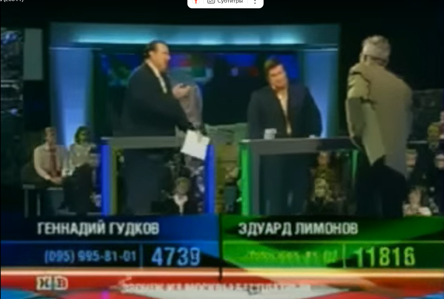 В дебатах 2004 года Лимонов победил Гудкова: более 86 тысяч зрителей против 27 тысяч. Удивительный результат, демонстрирующий уровень свободы, еще сохранявшийся тогда на центральных телеканалах. В 2009 году Лимонов писал в ЖЖ: